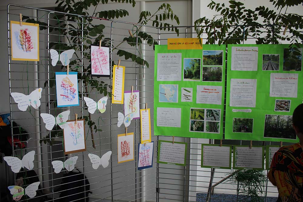 « Invasion à Keramporiel ! » Tels sont les mots pleins de sens inscrits sous les branches du stand de l’école pour présenter la présence du Robinier faux acacia en Bretagne. Espèce originaire d’Amérique du nord, importée pour consolider les abords des voies ferrées avec leurs racines, et fournissant un bois dur pour la confection des traverses de celles-ci. Les robiniers remplissent maintenant la voie verte, prenant la place d’espèces endémiques et créant de véritables forêts à eux seuls. Un conte forestier à ne pas louper.