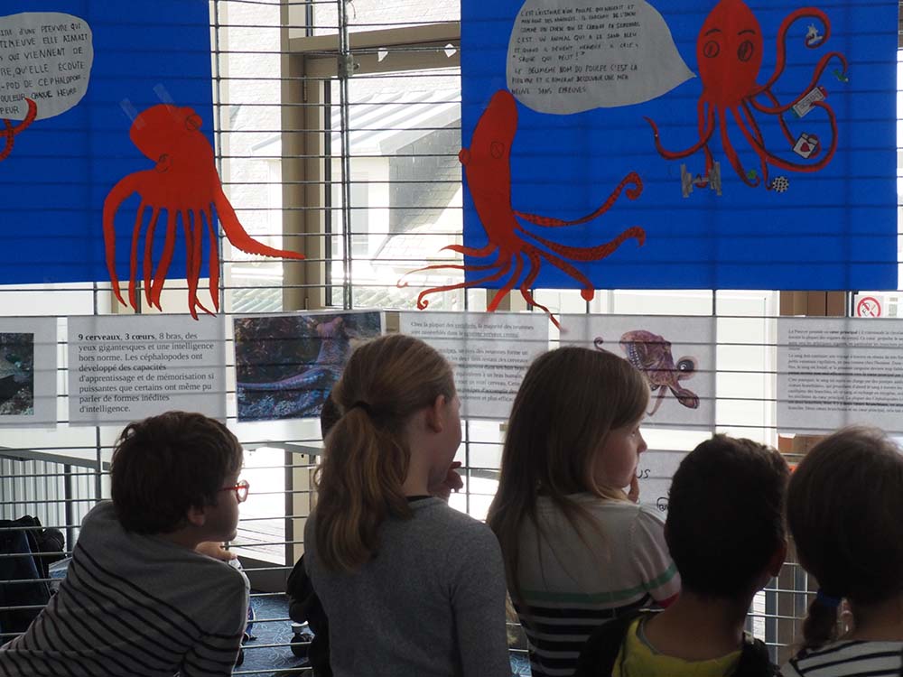 Chez les primaires de l’école de Kerandon à Concarneau, une spécialité : l’estran et le poulpe. Sous les pancartes bleues mer, tout en poésie, on venait au stand comprendre la biologie du mollusque, ses compétences extraordinaires et se faire expliquer les légendes qui rôdent autour de cet animal souvent romancé.