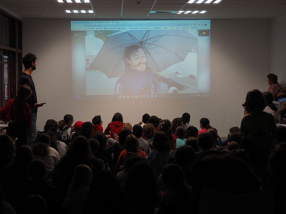 Ce parcours, jalonné de trois ateliers d’une heure chacun, alternait entre présentation à son propre stand, visite des autres stands et projection de reportages Captain Darwin (avec dessin d’une alouette à l’appui !). Les deux journées se terminaient par une visioconférence avec Victor : une occasion privilégiée pour les élèves de questionner le navigateur, l’explorateur et réalisateur.