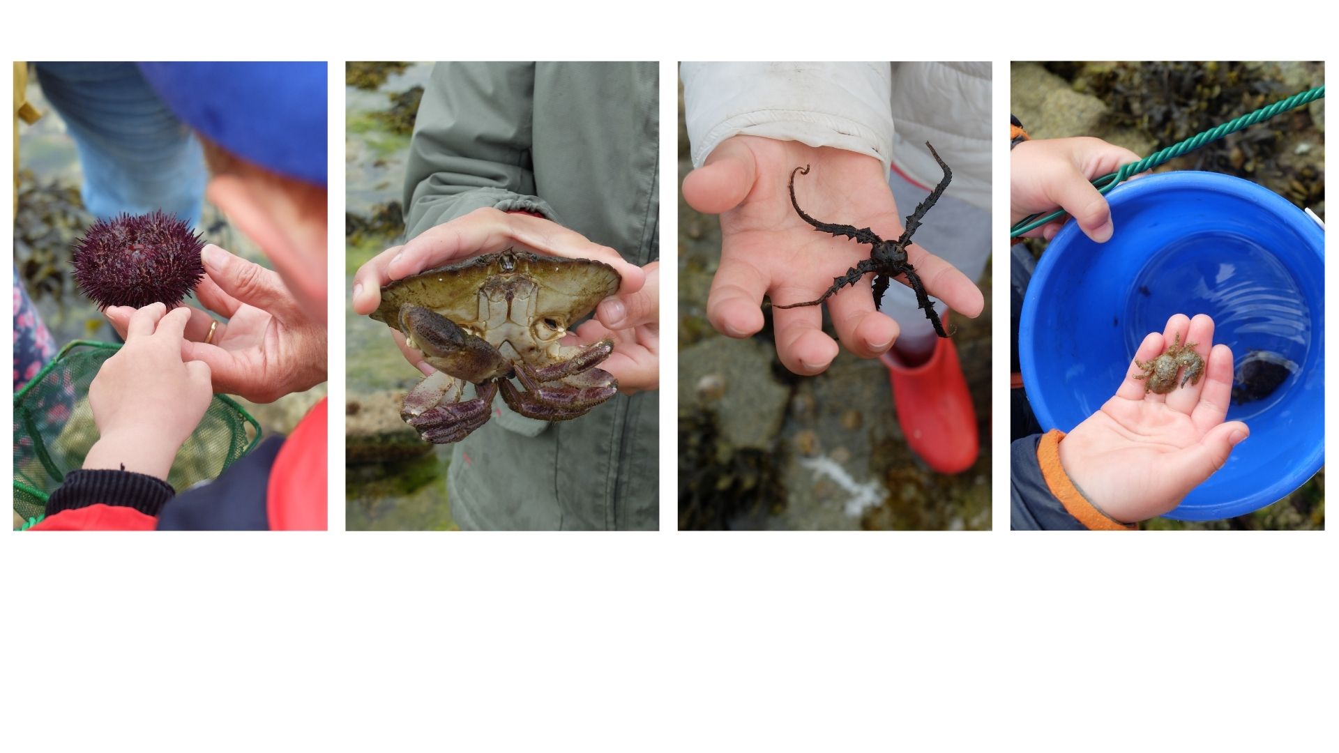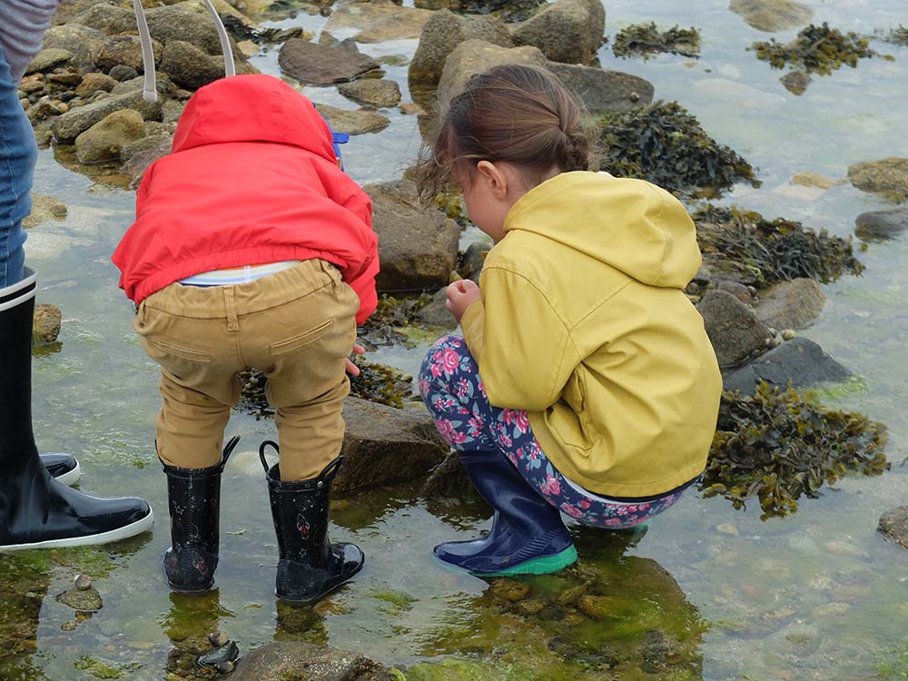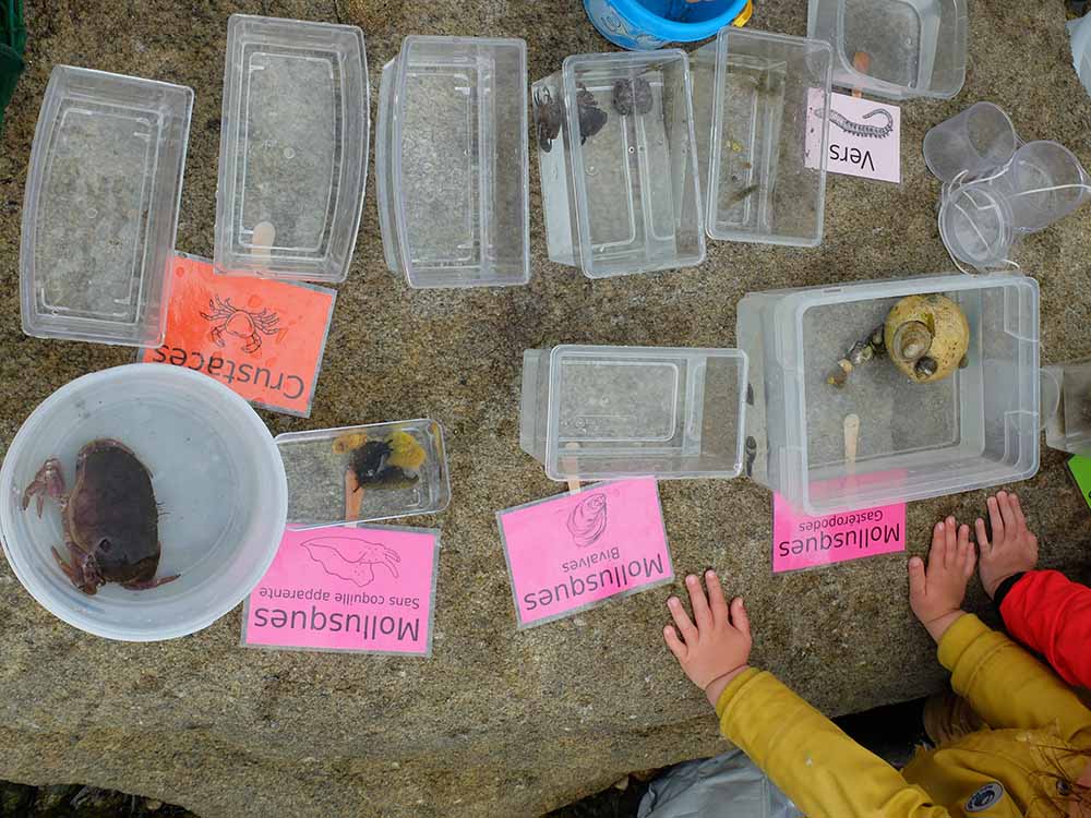 Mais dehors, la mer se retire : il est temps de partir dans la grève pour une pêche qui permettra de voir si nous pouvons observer les espèces citées en classe. Nathalie dispose les petits aquariums sur une grande pierre servant de table. Les enfants ont pour mission d’aller chercher des animaux avec des épuisettes et des seaux, puis de les disposer dans les bacs correspondant à chaque famille.