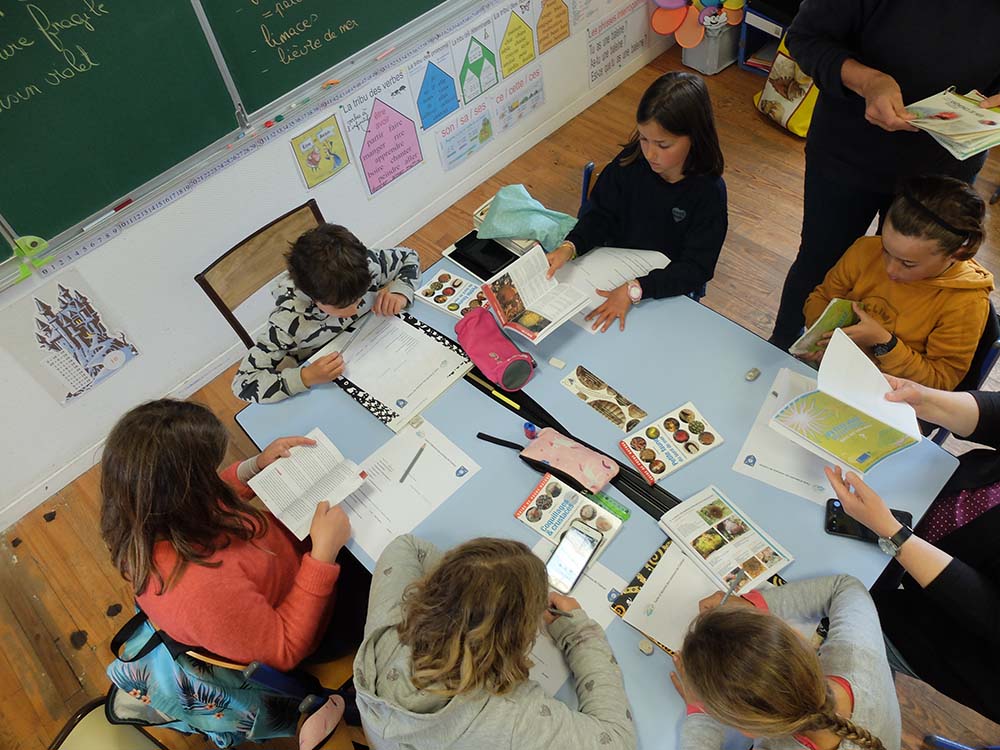 Une photo est placée au centre de la table et, à tour de rôle, les élèves répondent aux questions : « Est-ce que ce mollusque a une coquille en spirale comme celle d’un escargot ? » ou « Est-ce que ce crustacé est fixé sur un support ? ».