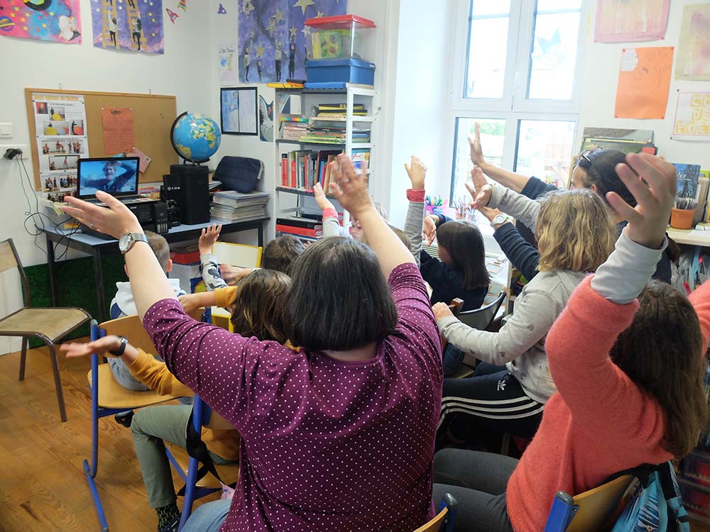 L’école primaire a choisi de travailler sur les espèces faunistiques de l’estran et plus précisément sur les crabes. Nathalie demande aux élèves s’ils savent pourquoi nous sommes là cette semaine en particulier. Les enfants ne savent pas trop, alors Nathalie leur demande s’ils ont vu quelque chose de particulier dehors dans le ciel. « La lune », répondent-ils ; en effet, la pleine lune étant le 16 mai, cela vient impacter les marées.