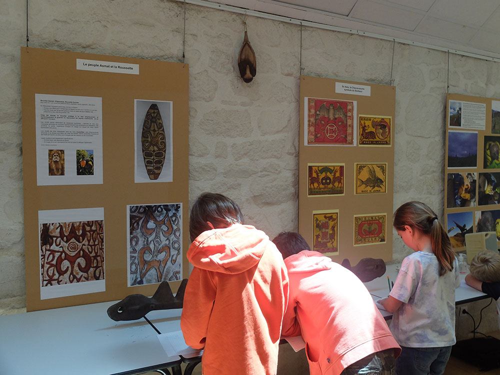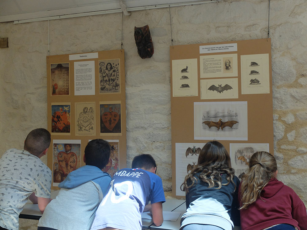 Pendant que les groupes se succèdent pour observer les chauves-souris, les élèves restés dans la salle d’exposition se plongent dans la lecture des panneaux. Une partie de l’exposition est consacrée à la perception des chauves-souris dans le monde : les enfants peuvent ainsi observer des sculptures venant des quatre coins de la planète, notamment de Papouasie, et mieux comprendre comment ces animaux sont perçus par différentes civilisations. En Asie, par exemple, ils sont parfois considérés comme des symboles d’éternité et de bonheur.