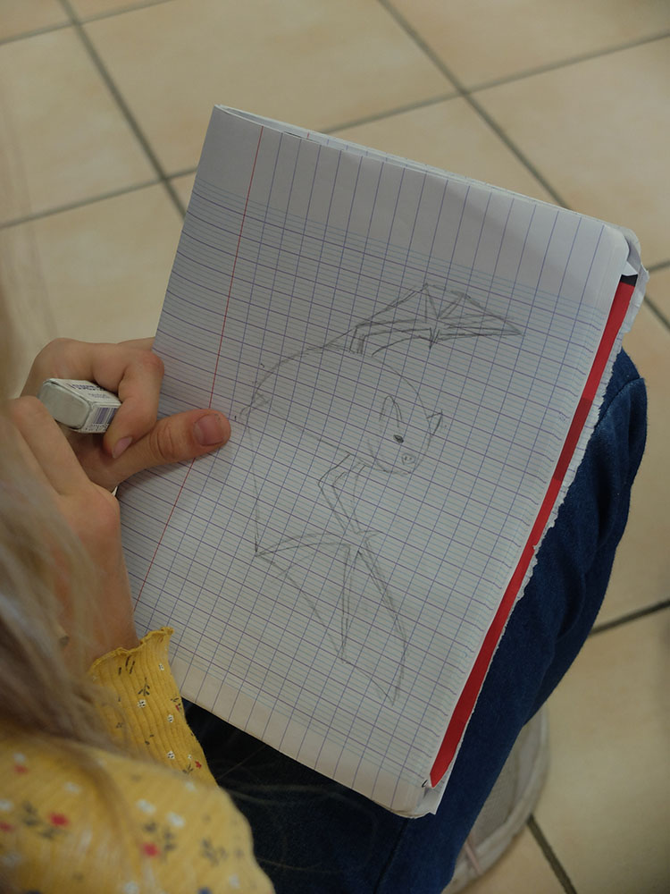 Après avoir étudié sculptures, peintures et gravures, certains élèves choisissent d’immortaliser leur découverte en dessinant une chauve-souris. Munis d’un crayon gris et de leur cahier de brouillon, ils s’attachent à représenter leur muse ailée.