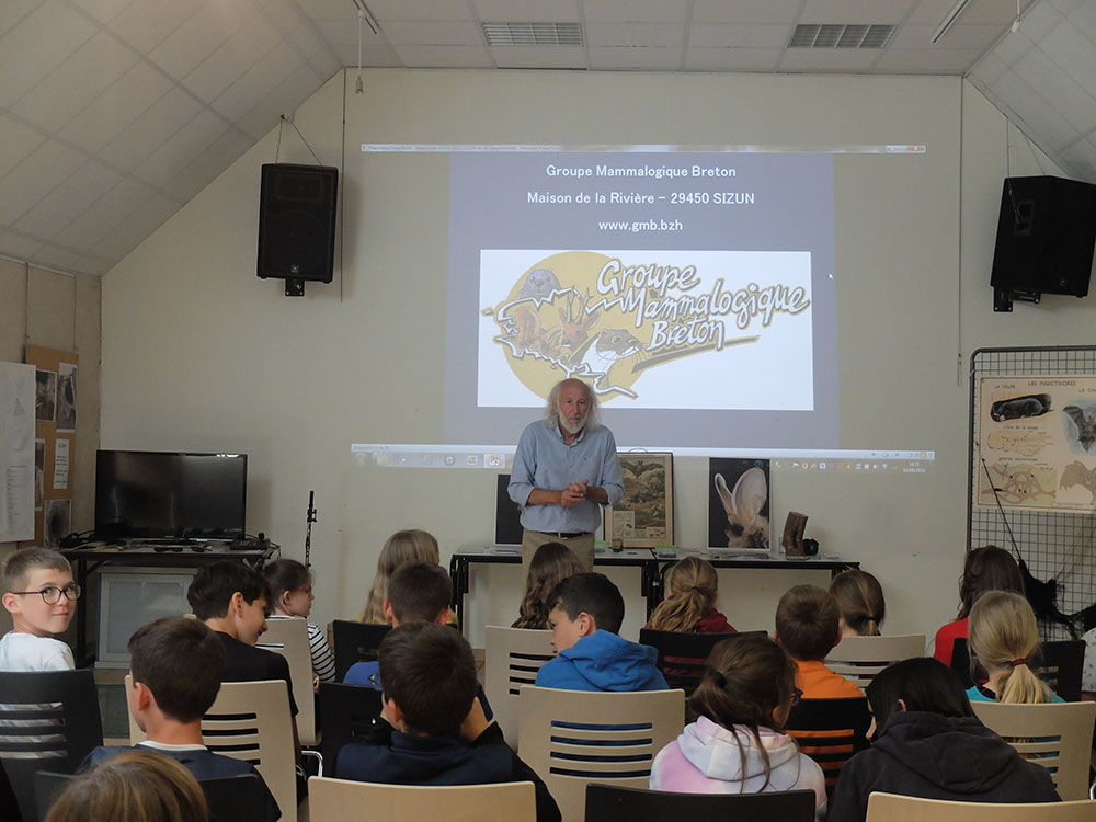 Christian rejoint alors les élèves restés dans la salle pour leur présenter le monde fascinant des mammifères volants. Les chiroptères (nom scientifique des chauves-souris) comptent plus de 1 000 espèces dans le monde, dont 30 en Europe. En Bretagne, ce sont les seuls mammifères capables de voler, et 17 espèces y ont été recensées. Parmi elles, les familles les plus représentées sont les Rhinolophidés, reconnaissables à leur feuille nasale en forme de fer à cheval, et les Vespertilionidés, caractérisés par un museau plus allongé.