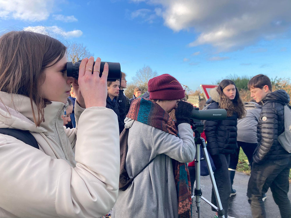 Nous partons sur les traces du Héron garde-bœufs, munis de caméras, de jumelles, de longues-vues et de solides chaussures de marche. Une première halte nous permet d’observer un cousin du garde-bœufs, le Héron cendré. Il se promène dans un champ à proximité du sentier. Nathalie réunit alors les élèves pour une introduction à la thématique du jour : les échassiers. « Ces oiseaux ont, au fil du temps, développé de longues pattes pour se nourrir sur le littoral, dans les marais et les zones humides », nous explique-t-elle, établissant un lien avec les travaux de Charles Darwin et sa célèbre découverte sur l’adaptation des becs des pinsons à leur environnement alimentaire.