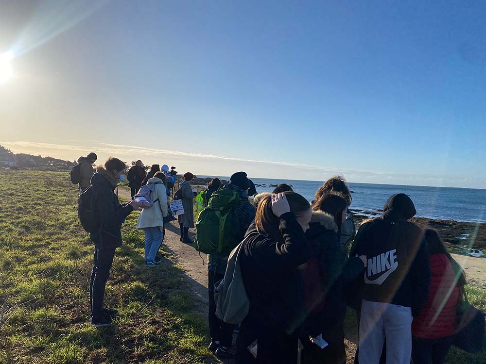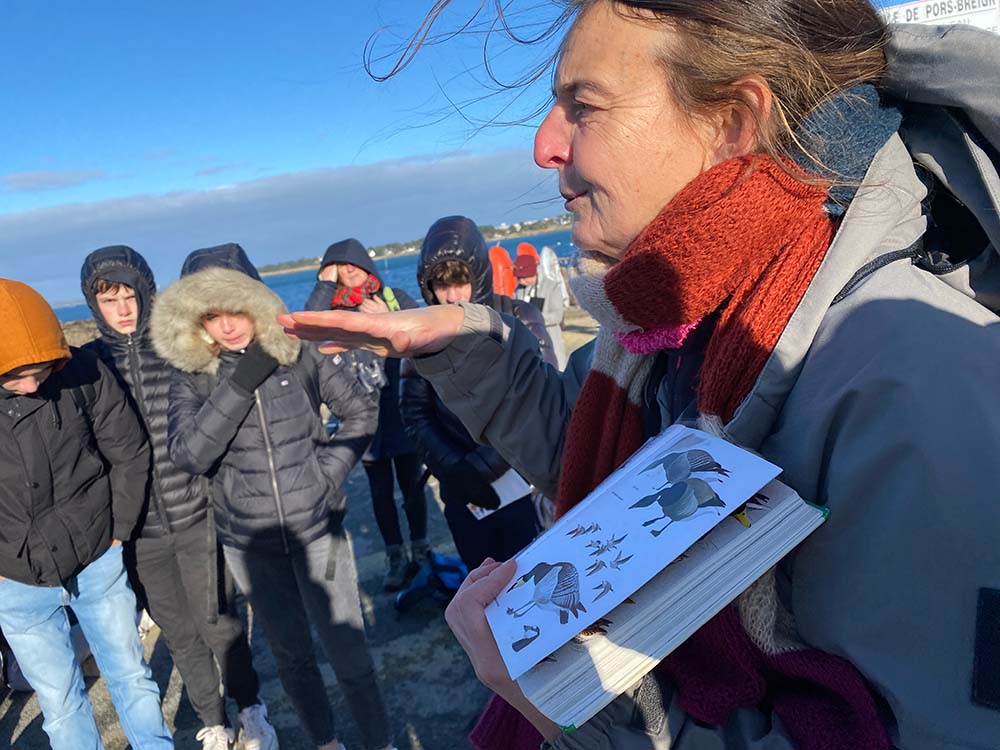 La marche se poursuit le long du littoral. Nous croisons des sternes, majestueuses en vol, rasantes comme des danseuses effleurant la surface de l’eau. Bientôt, face à la plage de Porzh Breign, plusieurs oies bernaches se dessinent à l’horizon. Nathalie invite alors les élèves à fermer les yeux, prêter l’oreille et percevoir les chants de la nature environnante. Malheureusement, le vent qui siffle dans nos oreilles masque quelque peu ces mélodies. Nous cherchons un abri et revenons à l’écoute : mésange charbonnière, rouge-gorge, pipit farlouse, troglodyte mignon, pic vert : autant de chants qui s’entrelacent dans ce moment de tranquillité.