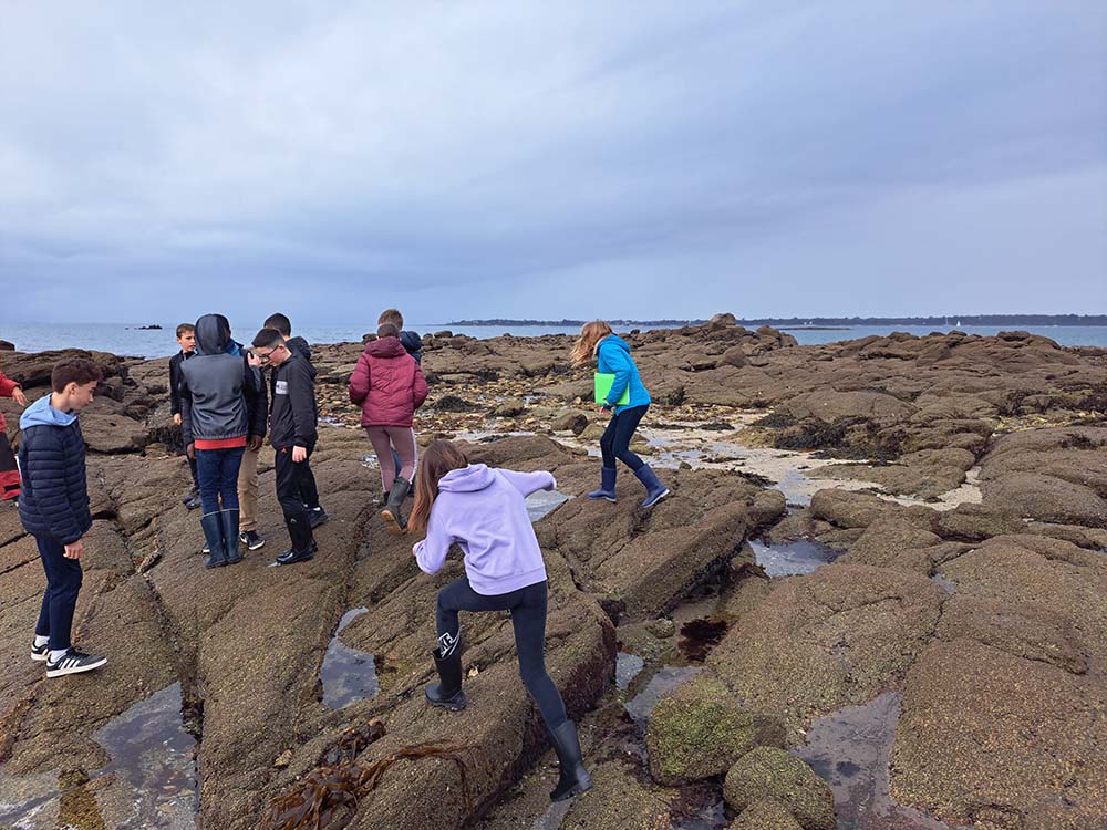 La classe de 5ᵉ du Collège des Sables Blancs est sortie sur l’estran concarnois pour observer ces animaux fascinants. Animée par Nathalie Delliou, cette sortie s’annonçait pluvieuse, mais riche en découvertes. Une première présentation en classe a permis de mieux cerner ce qui constitue cet embranchement si particulier du vivant. Ces animaux possèdent un exosquelette formé de chitine et de carbonate de calcium, à la fois robuste et souple.