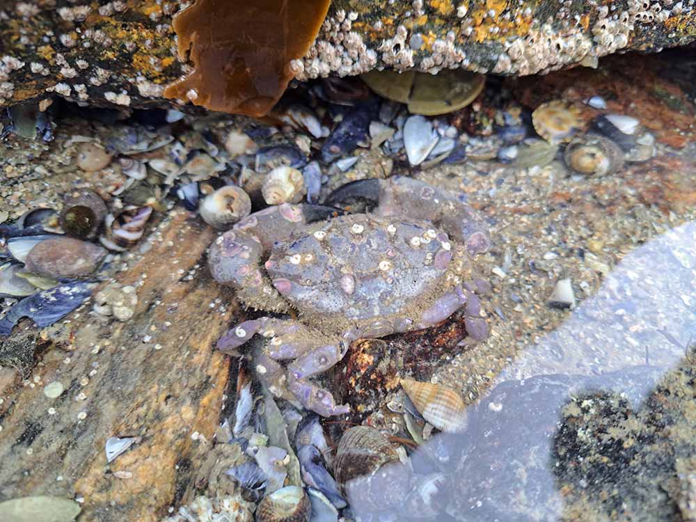 Plusieurs crabes sont débusqués sous les rochers, mâles et femelles, que l’on peut distinguer grâce à un dimorphisme sexuel : les mâles ont un abdomen plus étroit et en forme de triangle, tandis que celui des femelles est plus large et légèrement arrondi.