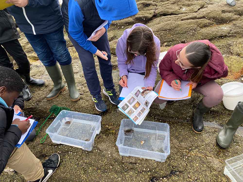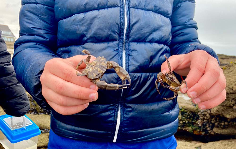 Les bacs se remplissent après une heure de collecte. À l’aide de guides d’identification et de l’application Bernic&Clic, les élèves s’efforcent de nommer les espèces qu’ils ont devant eux. Plusieurs espèces de crabes sont identifiées : crabe vert, crabe de pierre, porcelaine grise, étrille, tourteau et crabe marbré.
