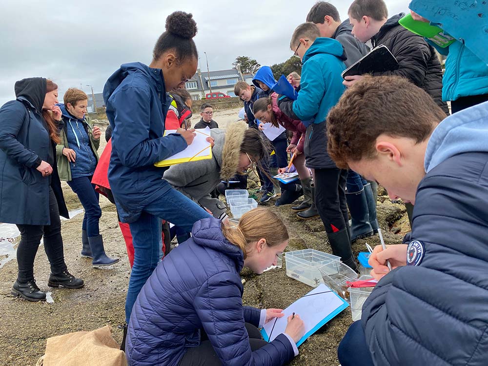 Une deuxième activité est proposée : dessiner trois espèces de son choix. Les élèves s’appliquent avec soin et réalisent des croquis d’une grande précision. Certains s’essaient à dessiner différents types de crabes, d’autres dessinent l’étoile de mer glaciaire ou encore la limace de mer. Ces dessins naturalistes leur permettront de fixer visuellement les observations qu’ils viennent de faire. Des détails comme la forme de la carapace des crabes ou le nombre de bras des étoiles de mer sont ainsi retenus, et pourront être présentés lors d’une visioconférence où ils compareront les crabes au poulpe du Cap-Vert. Le thème de cette comparaison : bien que crabes et poulpes vivent tous deux sur l’estran, ils l’habitent de manière très différente.