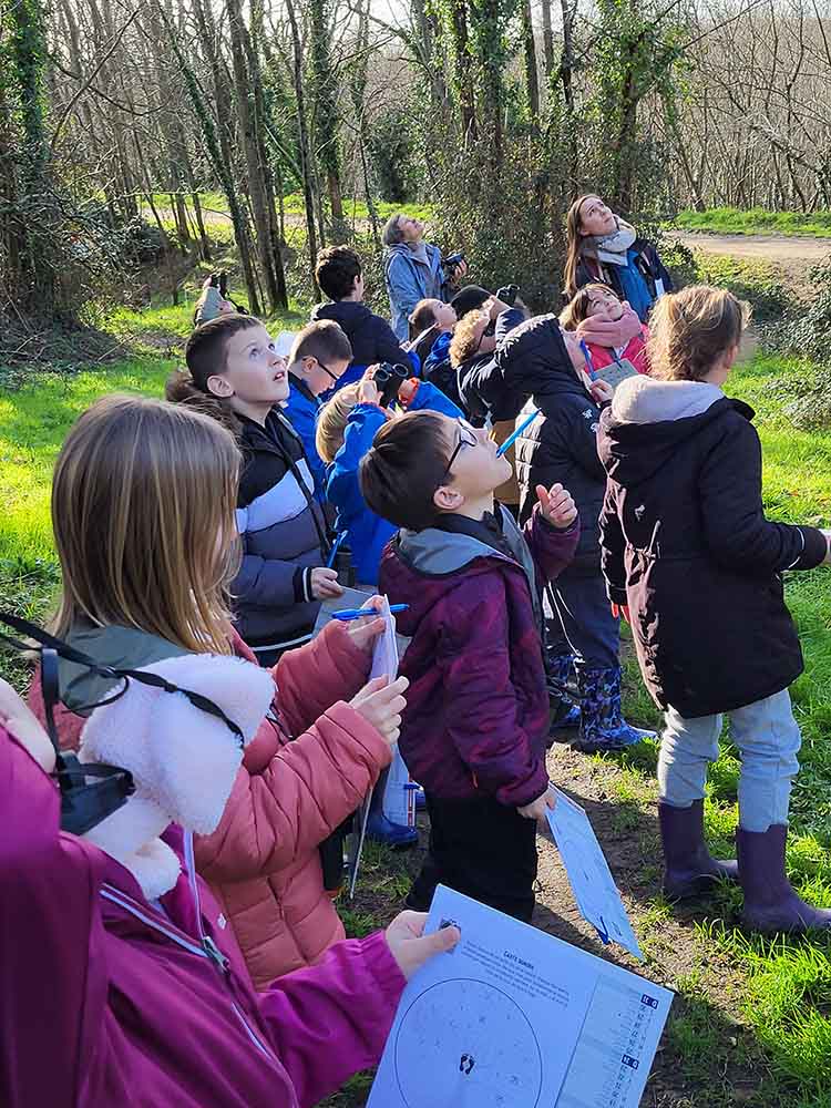 Les enfants restent immobiles et attentifs, dessinant une croix sur leur feuille chaque fois qu’ils entendent un chant. Cette activité révèle l’omniprésence et la diversité des oiseaux autour de nous.