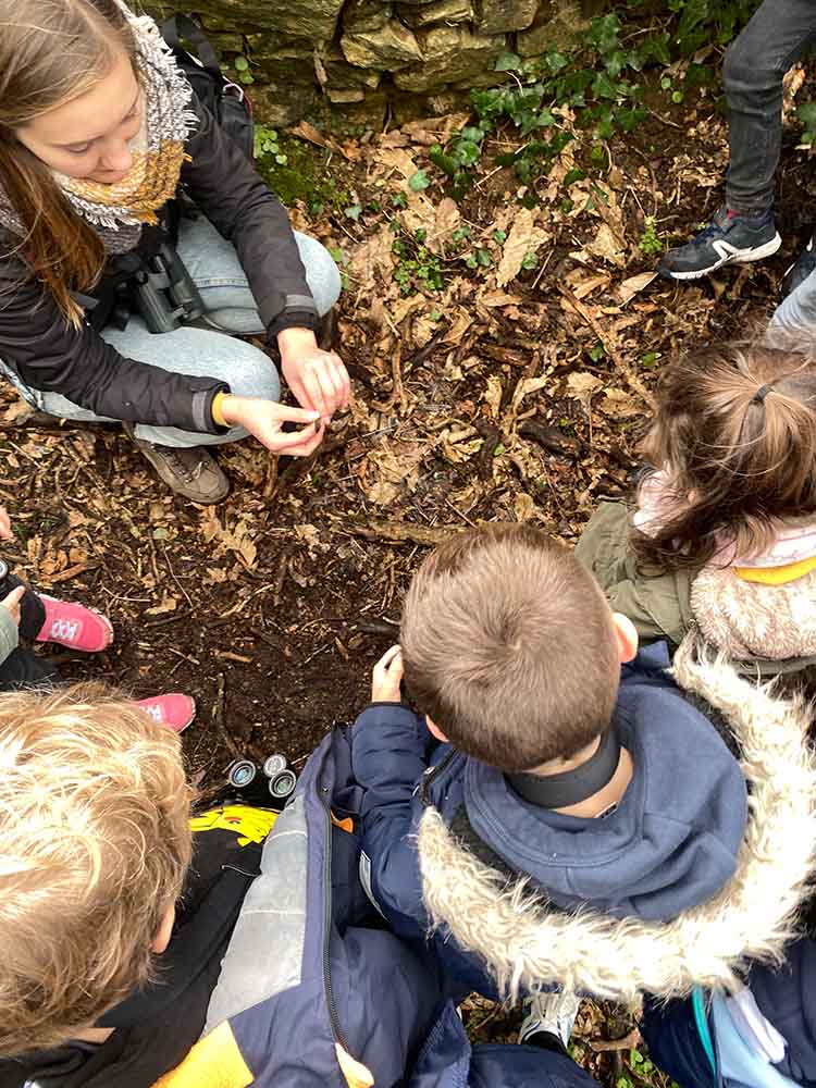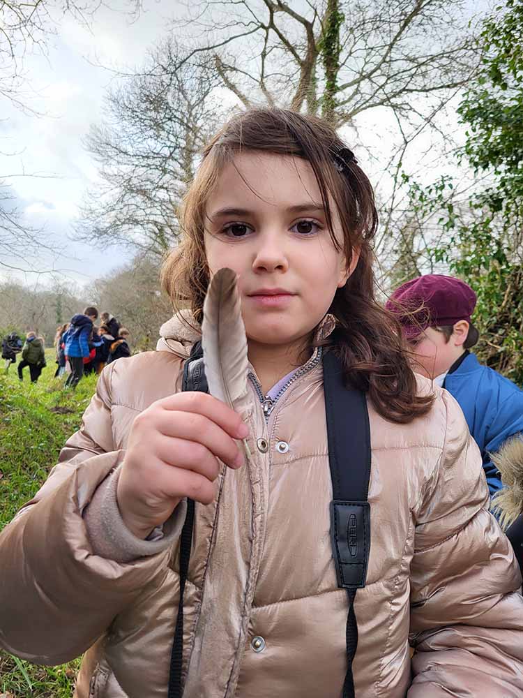 Nous arpentons la campagne de Cadol, et une multitude d’oiseaux se font entendre et voir. Audrey propose alors un petit jeu : “le roi du silence”. Tous ferment les yeux et les bouches pendant deux minutes pour écouter la vie qui nous entoure. À chaque chant d’oiseau entendu, les enfants comptent : un… deux… trois… Ils sont nombreux, cachés dans les arbres, à former une véritable chorale. Audrey nous aide à identifier certains chants : rouge-gorge, mésange, merle, peut-être même un troglodyte mignon. Mais pour l’instant, aucun héron ne se montre.