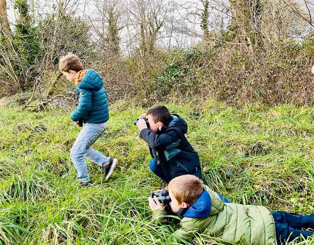 Nous continuons notre chemin à travers des sentiers boueux, parfois en traversant des mares trop larges pour être enjambées. Les oreilles et les yeux grands ouverts, les enfants s’appliquent à mener leur mission à bien : trouver le Héron garde-bœufs. Certains prennent des attitudes de véritables naturalistes et se retrouvent au sol, jumelles aux yeux, scrutant méticuleusement l’horizon. Ces mouvements marquent peut-être les prémices d’une carrière d’affût. D’autres éprouvent encore des difficultés à observer avec leurs jumelles, mais l’après-midi se déroule dans la joie.