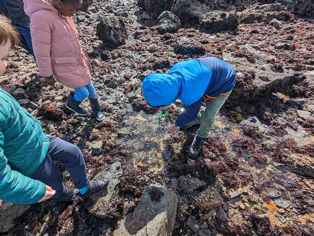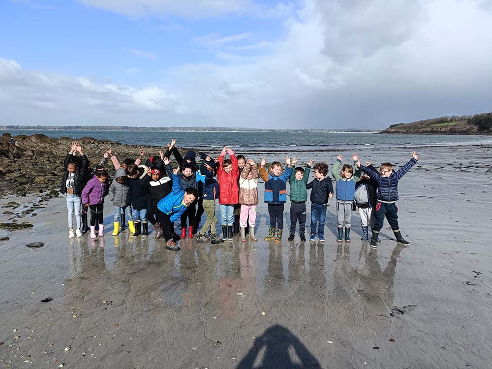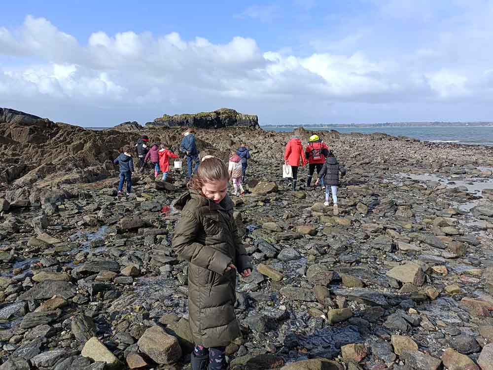 De plus, quelques invités sont présents : des bénévoles de l’association Esprit Nature. Ils sont trois, chacun d’entre eux prend un groupe de cinq élèves, et part en quête des trésors du retrait du large. C’est une grande marée, donc il y a beaucoup à explorer.