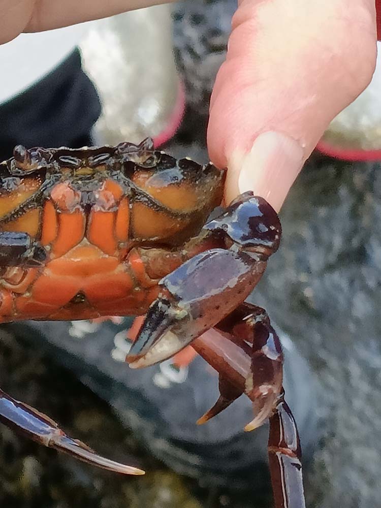 Des hermelles attirent notre attention avec leurs bioconstructions en sable qui recouvrent la plupart des rochers. Plus nous avançons, plus nous atteignons la zone de marée. C’est l’endroit propice pour trouver des crabes, et il y en a plein qui sommeillent ! Nous suivons les indications de Nathalie pour les trouver : les rochers doivent revenir à leur place et nous ne prélevons que les plus gros.