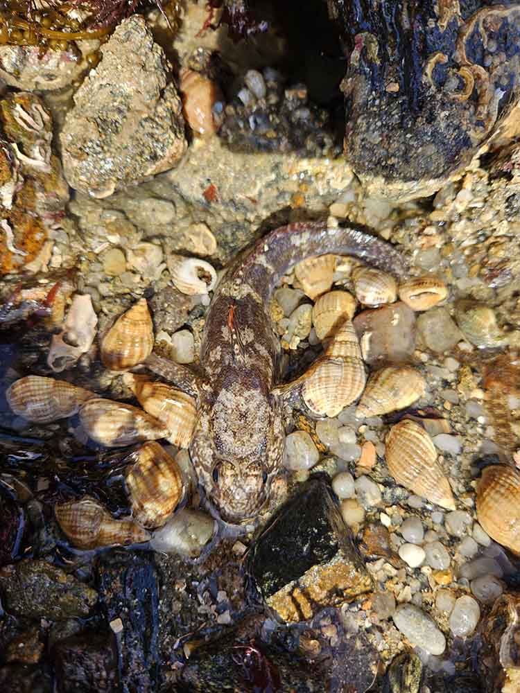 Un peu plus loin, nous trouvons une éponge commune, reconnaissable à sa couleur orange. Des berniques aussi, qui ont formé leur coquille de sorte à être parfaitement hermétiques sur leur rocher. Qui les reconnaissent entre mille, littéralement ! Car elles reviennent toujours à leur place, grâce à une enzyme qui leur sert à se repérer. Des bigorneaux, des moules, des huîtres, un monde de coquillages, de mollusques, et de bivalves s’offre à nous.