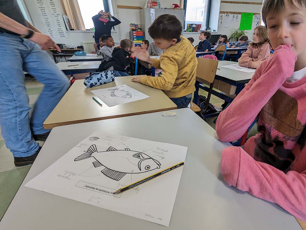 Une fois de plus, c’est Nathalie Delliou d’Esprit Nature qui va nous faire découvrir la biodiversité de Concarneau. Nous commençons en classe pour nous remettre en tête une multitude d’informations. Par exemple, comment se nomment les nageoires des poissons ? À quoi leur servent-elles ? De la nageoire pectorale à la ventrale, en passant par la caudale, tout est une histoire d’évolutions. Les branchies, par exemple, servent à respirer aux poissons et aux crustacés. Ces filtres accrochent l’air présent dans l’eau en mouvement et permettent ainsi une respiration bien pratique, contrairement aux baleines qui sont contraintes de remonter à la surface puisqu’elles sont des mammifères, et non des poissons. Dans la grande famille des poissons, il y a aussi les requins, qui possèdent des écailles tellement fusionnées que cela forme une peau lisse.