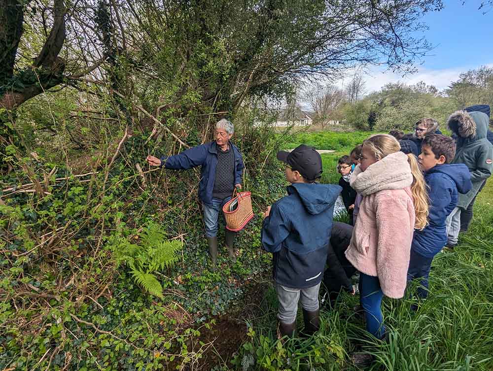 Avec le temps breton typique – mi-pluie, mi-soleil – nous nous munissons de bottes étanches pour partir au parc, situé juste en face de l’école. Et la sortie commence dès l’entrée ! Yannick nous montre la plante qui domine autour du ruisseau sous le pont : l’œnanthe safranée. Cette plante possède une racine hautement toxique, capable de tuer un bovin ! Une entrée en matière qui fait froid dans le dos !