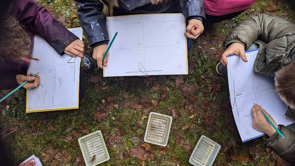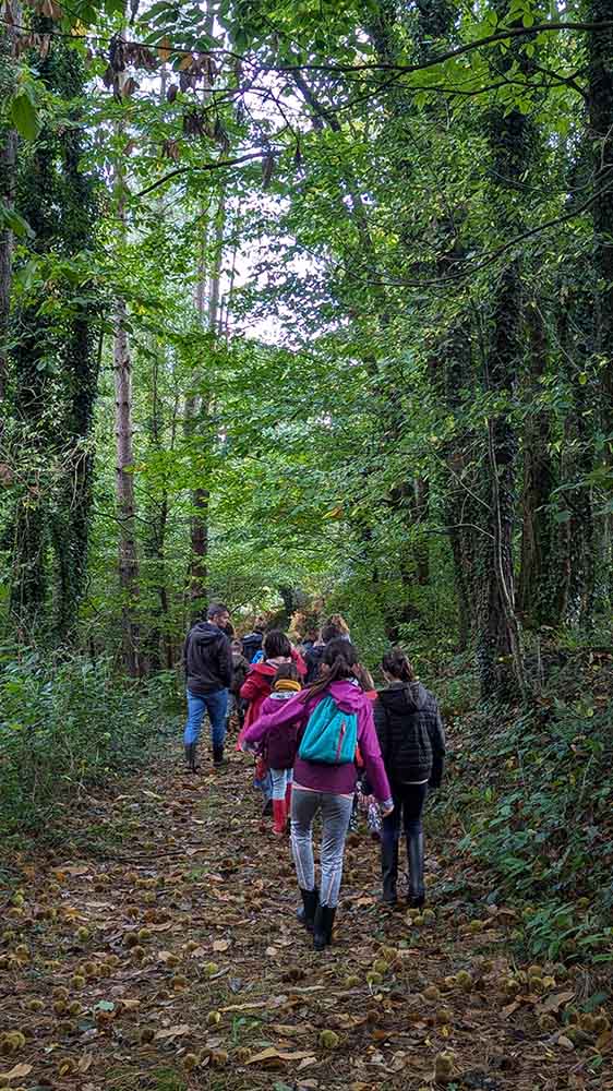 Nous enfilons nos bottes, attachons nos gourdes à notre cou, et partons pour 10 minutes de marche au cœur de la forêt juste « sous » l’école. C’est plutôt pratique, et nous met tout de suite en mode observateur silencieux puisque le chemin pénètre une zone à la fois privée et publique, où nous croisons déjà différents animaux. Aurore, la professeure, nous fait remarquer que notre silence nous permet de repérer les différents oiseaux nous survolant. L’un d’eux alerte ces compères de notre présence, comme une sonnette d’alarme, dans un tintamarre remarquable.