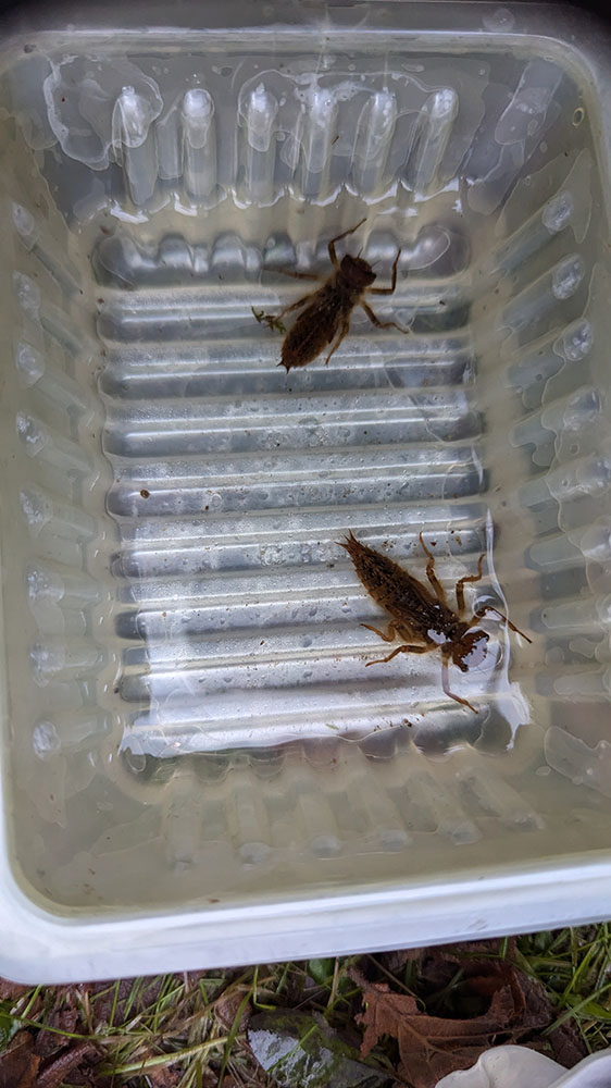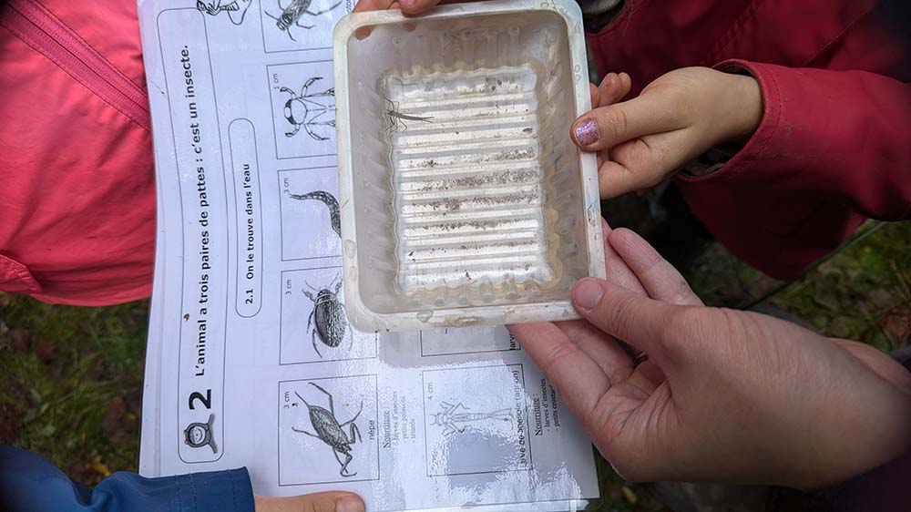 Lorsque la pêche prend fin, Marion nous donne des clefs de détermination afin d’identifier ces petites bêtes. Ce n’est pas compliqué, il faut compter les paires. Et une paire c’est combien ? Une paire, c’est deux membres ! Nous, nous avons une paire de mains ! Alors avec des insectes nous allons vite compter plusieurs paires ! Le premier élément de la clef de détermination c’est « il n’y a aucune patte », le second c’est « il y a 3 paires de pattes », et le dernier « Il y a 4 paires de pattes ». Chaque binôme s’attèle à la tâche ardue de compter les pattes d’un petit individu ne cessant de se déplacer, ou de se cacher. Certains spécimens parviennent même à s’échapper et à retrouver le chemin vers l’eau ! Heureusement, certaines espèces sont plus faciles à identifier que d’autres, et Marion et Yves sont là pour valider nos observations. Il y a des larves de libellules, des larves de demoiselles, des araignées d’eau, des trichoptères… Une multitude de vies ! Marion et Yves nous ont initiés aux techniques des vrais scientifiques qui étudient la faune et la flore du monde entier avec leurs loupes et leurs clefs de détermination, un poil plus compliquées que les nôtres !