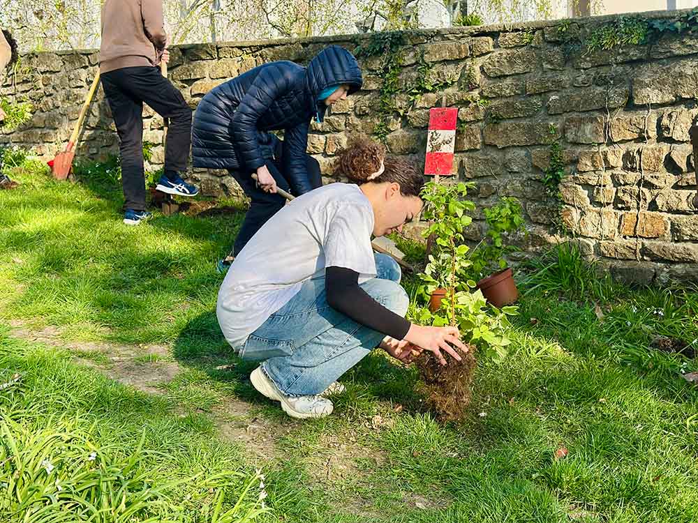 Le jour J, une vingtaine d’éco-délégués sont prêts et prêtes, le soleil ajoute sa touche. Après des outils de jardinage et des techniques de plantation, chacun a pu mettre la main à la terre pour planter près de 60 plants. Une vingtaine de plants seront plantés d’ici les prochaines semaines.