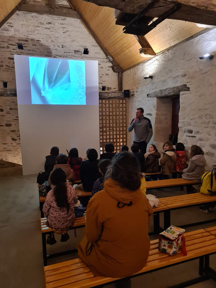 Il est 10h, Maël nous présente les anciennes locataires du grenier au dessus de nos têtes : les chauves-souris Grand Rhinolophes. Nous visionnons les images prises par un piège photo déposé dans le grenier, nous permettant d’admirer ces animaux nocturnes sans les déranger.