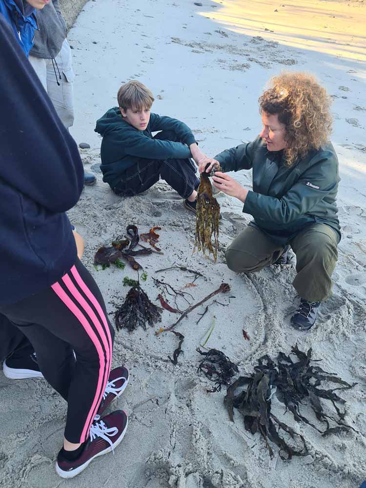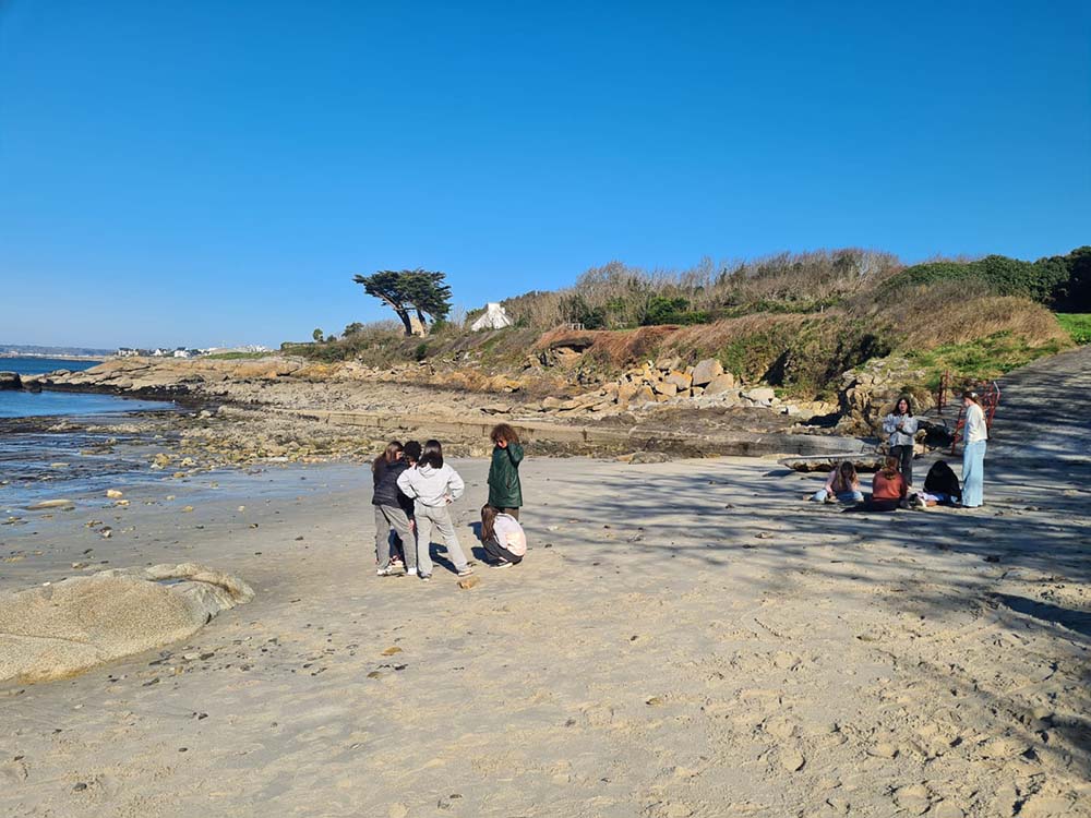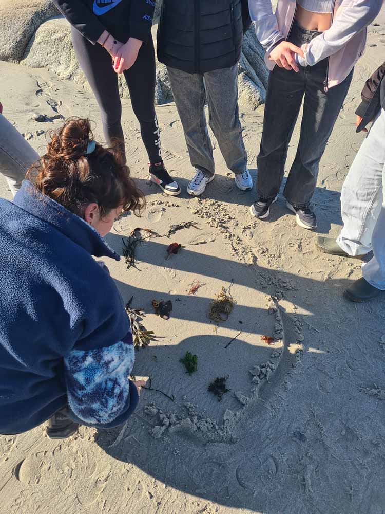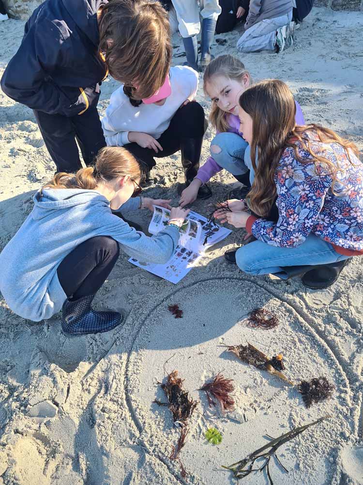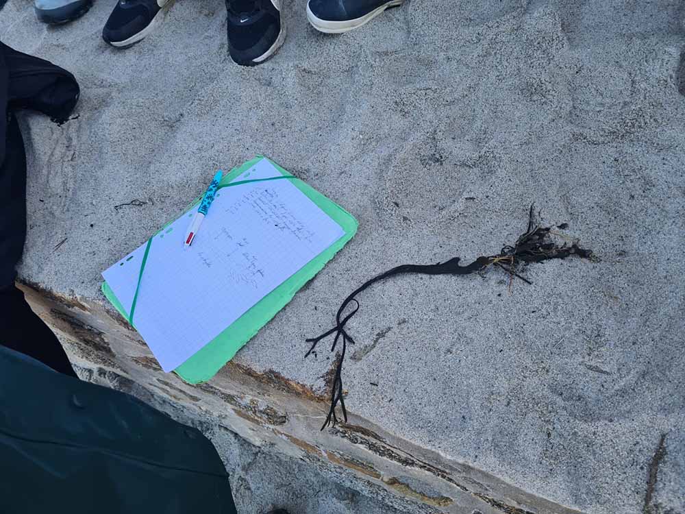 Ensuite, il nous suffit de 5 minutes à pieds pour rejoindre la plage, sur laquelle les élèves forment 6 groupes. Nous avons de la chance, le soleil est de la partie. Le premier défi est donné par Noëlla : Faire un cercle dans le sable, et ramener, en 10 minutes, le plus d’algues différentes possibles.