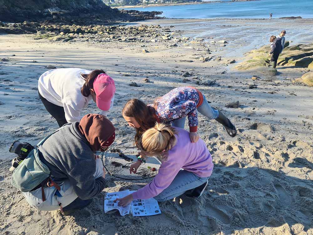 C’est parti pour le troisième défi : aller identifier des algues plus bas sur l’entrant, là où la marée basse les a découvertes. Ces algues-là, encore accrochées aux rochers, sont vivantes, la consigne est donc donnée de les observer sans les ramasser. Noëlla donne des cartes aux élèves, et ils doivent, par groupe, retrouver l’espèce représentée. Les élèves se dispersent sur les rochers, curieux de trouver les espèces en photo sur leur carte. À la fin, une surprise les attend, et la compétition est rude pour ce troisième défi.