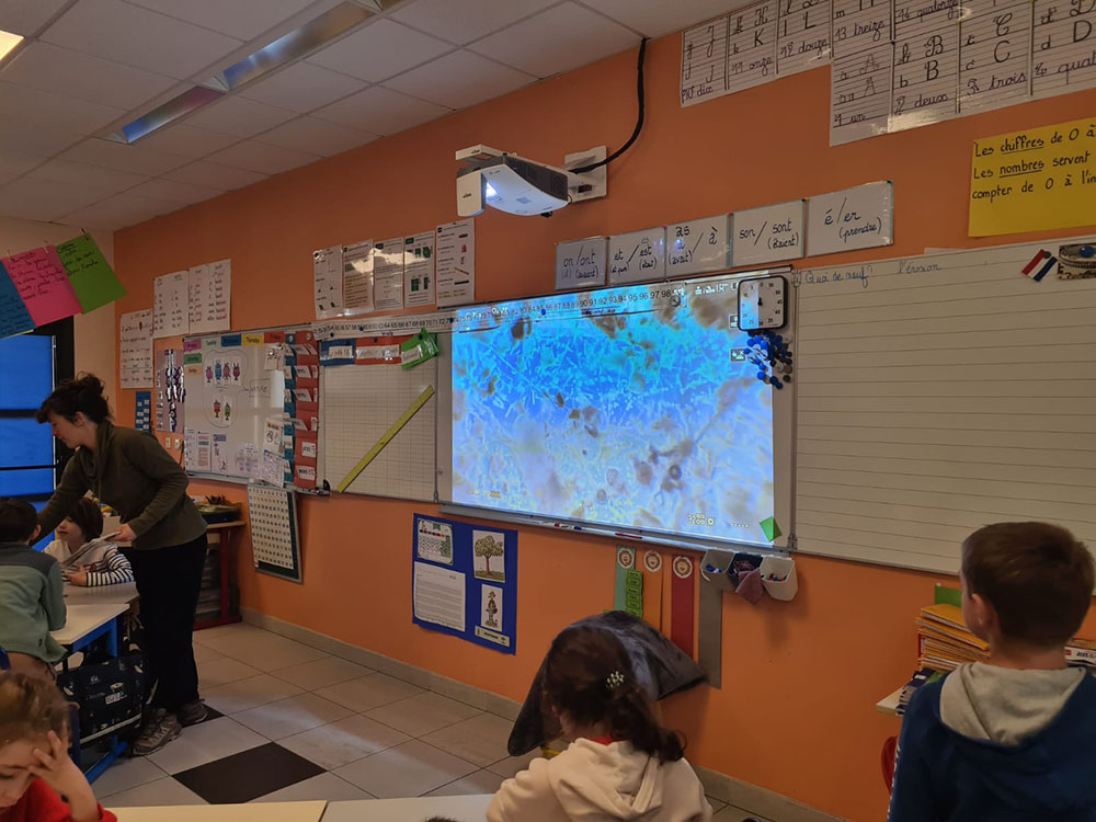 Elle passe ensuite de groupe en groupe pour récolter des prélèvements à la pipette, et dépose des gouttes sur une lame, qui est posée ensuite sur le microscope. Le résultat observé est projeté au tableau : ça bouge dans tous les sens ! Noëlla essaie même de rediluer le prélèvement tellement il est concentré, ce qui nous empêche de bien voir.
